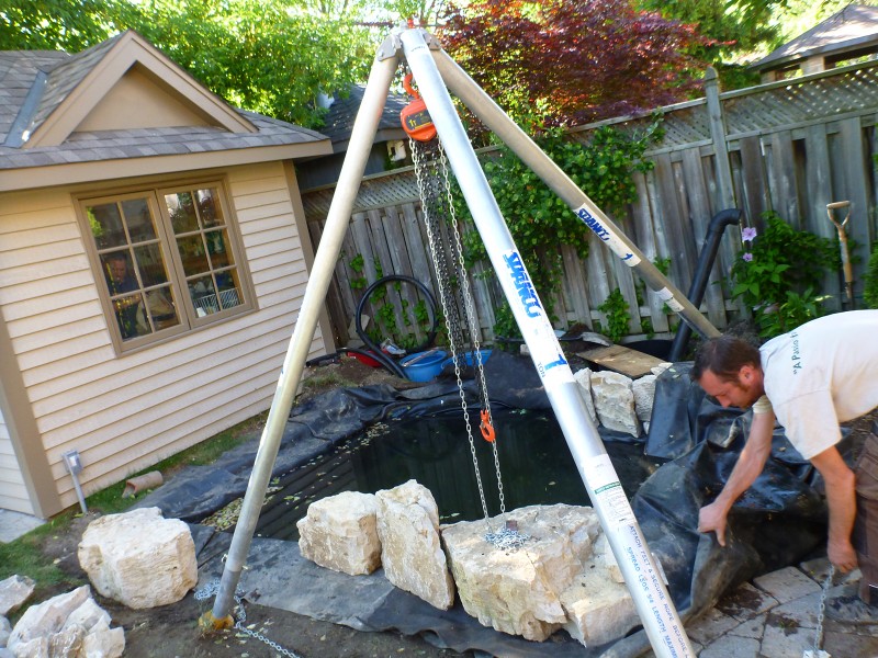 Have the right tools and equipment is essential for any project. Here our tripod hoist allows us to gently lower and position a heavy stone on the liner without damage. Superior to a bobcat when moving just a few stones or when access is a problem